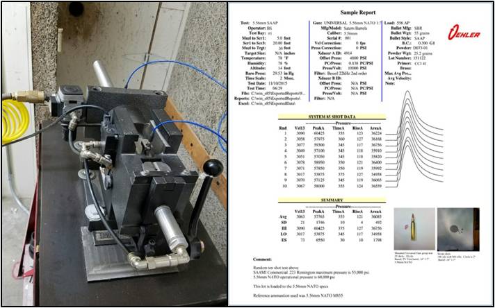 We have an on-site ballistic lab for testing pressures and velocities using Oehler equipment (ballistic computer 85 and model 57 system for velocities). Being a member SAAMI (Sporting Arms and Ammunition Manufacturers' Institute), we primarily use SAAMI methods and procedures in conducting ballistic testing. However, we can test using C.I.P. (Permanent International Commission for the Proof of Small Arms) , NATO EPVAT, or US DoD SCATP methods depending on the caliber and testing requirements. We have a variety of ranges to conduct ballistic and accuracy testing. Our indoor range can support up to 338 Lapua Magnum, while outdoor ranges support armor piercing (AP) testing and accuracy testing out to 2000m. Our fixed-mounted gun platform for the outdoor ranges can support up to 14.5mm. Other tools are Doppler Ballistic Radar (for long range measurements on outdoor ranges), high speed cameras, and Brinell hardness test equipment to certify ballistic steel plates used in our AP development and testing.